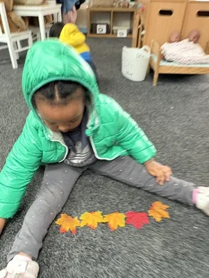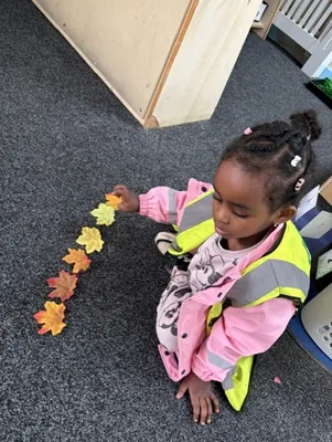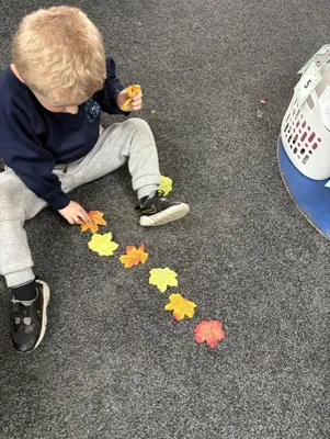 We have noticed that the leaves are falling down! We have been collecting leaves and looking at making patterns with them. Sometimes we make the patterns by colour and shape, and sometimes we put them in a line.